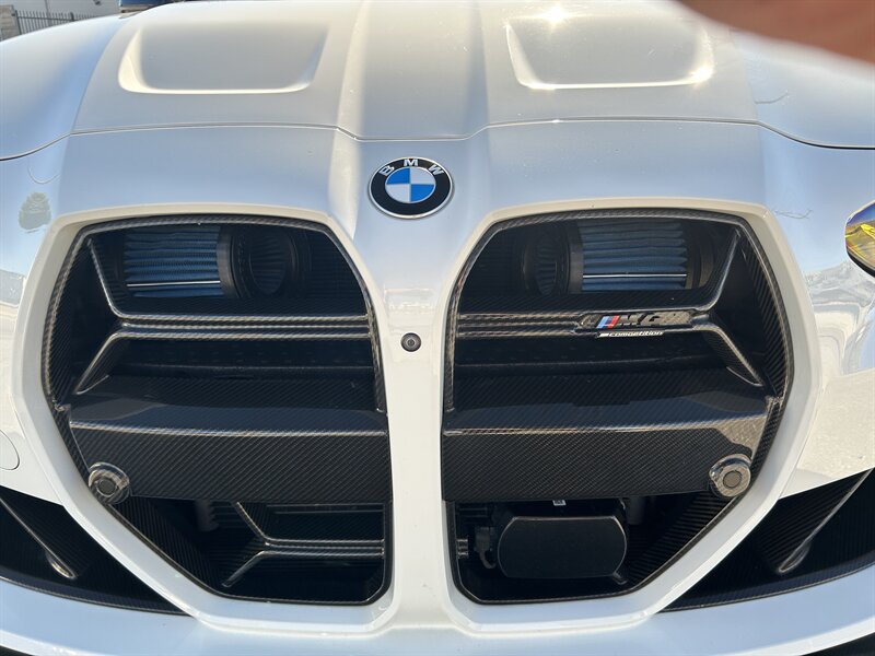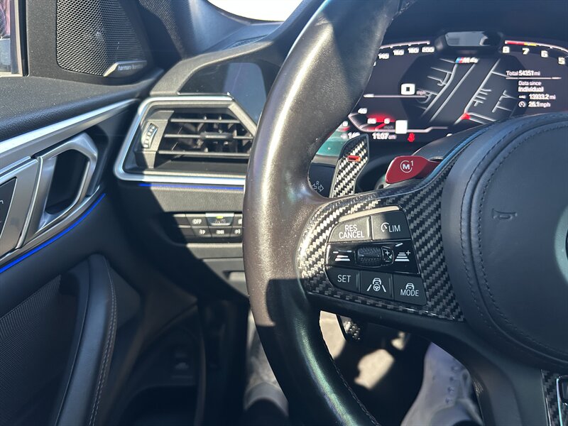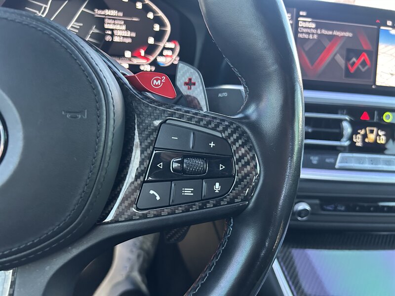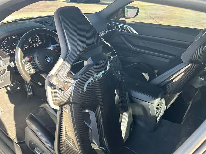 Draped in a striking Alpine White finish, the M4 Competition commands attention on the road. The aggressive stance is complemented by the M Carbon Exterior Package, enhancing aerodynamics and aesthetics with carbon fiber accents that reflect its high-performance pedigree. The vehicle sits on stunning 19/20 inch M Dual-Spoke Black Forged 826M Wheels, which not only add to its visual allure but also contribute to improved handling dynamics.