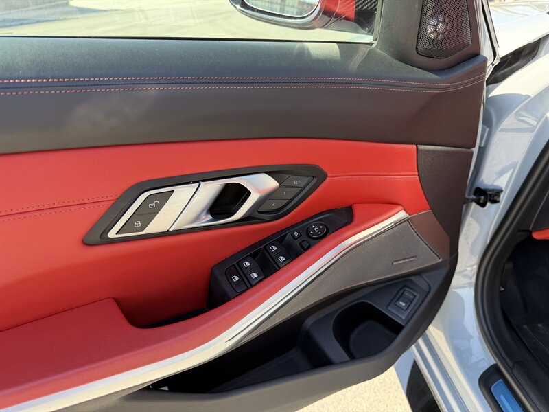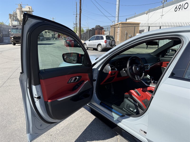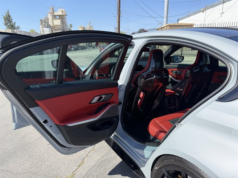 2022 BMW M3 Competition xDrive — Brooklyn Grey Metallic exterior with Fiona Red/Black interior. Powered by the S58 3.0L Twin Turbo I6 delivering 503 hp and 479 lb-ft, paired with an 8-speed M Steptronic transmission and BMW M xDrive for engaging all-wheel traction and configurable rear-bias driving dynamics. This example includes the Driving Assistance Professional, Executive and Parking Assistance packages, plus premium options such as M Carbon Ceramic Brakes, M Carbon Exterior and Interior trim, M Carbon bucket seats, Carbon Fiber interior trim, Wireless Charging, Icon Adaptive LED Headlights with Laserlight, Front Ventilated Seats, Full Merino Leather upholstery and 19/20 in. M Double-Spoke Orbit Grey wheels.