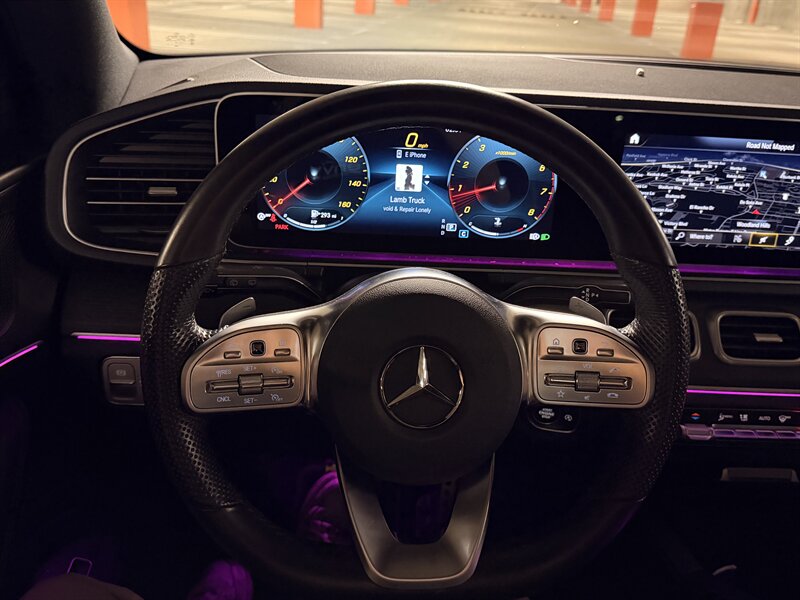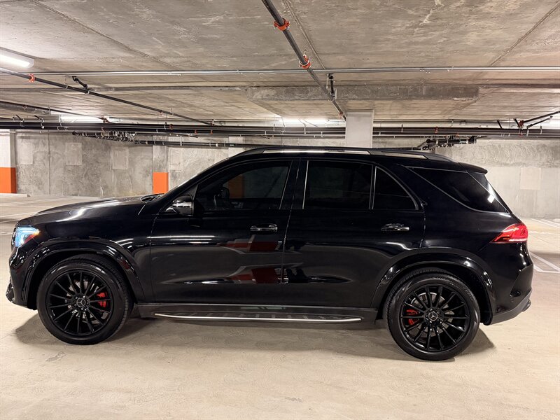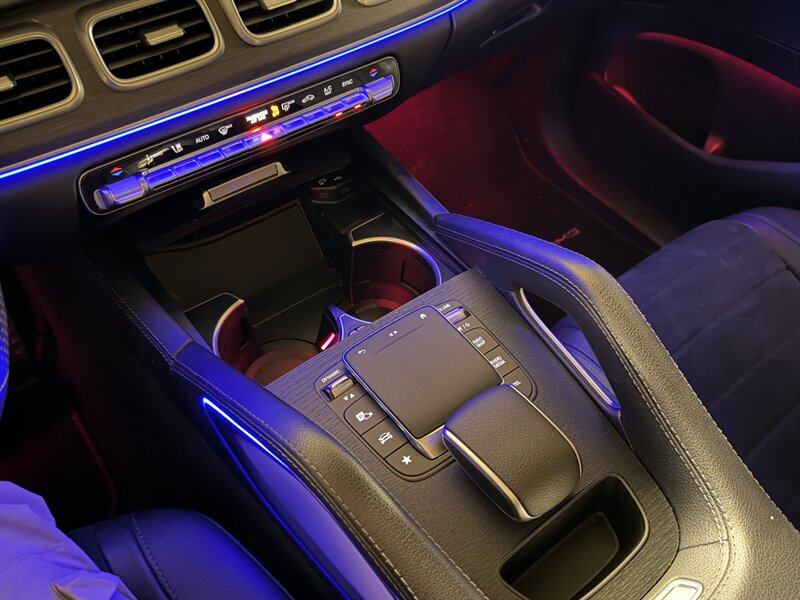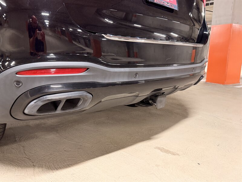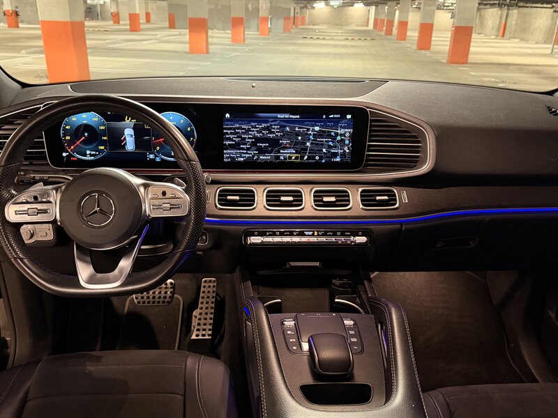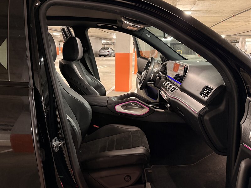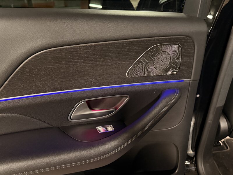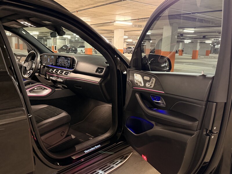 Factory-installed equipment (detailed): AMG Line Exterior and AMG Line Interior with AMG sport body styling and trim plus the AMG Line w/ Night Package for blacked-out exterior accents; Driver Assistance Package PLUS providing advanced safety technologies such as adaptive cruise control, active emergency braking and lane-assistance systems; Premium Package enhancing comfort and convenience and infotainment features. Additional factory options include 4-Zone Automatic Climate Control, All-Season Front & Rear Floor Mats, Aluminum Longitudinal-Grain Interior Trim, Heated Steering Wheel, Heated & Cooled Cup Holders, Passenger Seat Memory, Body-Color Roof Spoiler, Chrome Door Handle Inserts, Obsidian Black Metallic paint, Head-Up Display, LED Intelligent Light System, Panorama Sunroof, Black Exclusive Nappa Leather, MBUX Interior Assistant, Trailer Hitch and 21-inch AMG Multi-Spoke wheels.