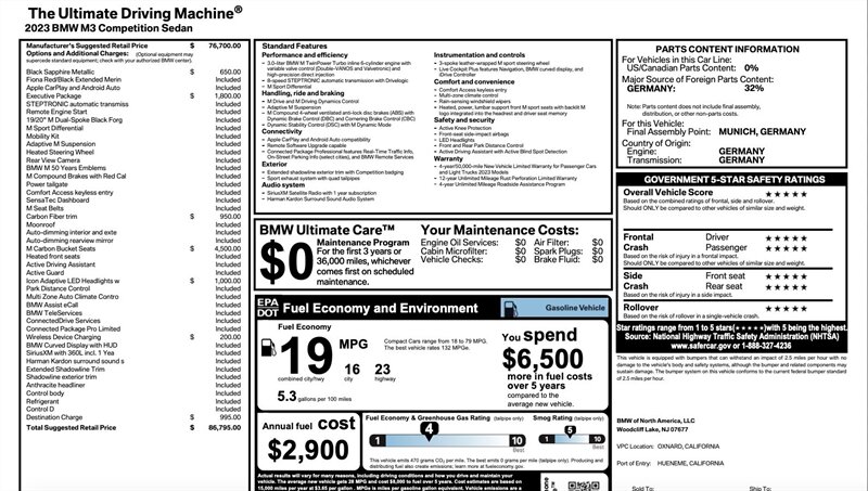 The M Compound Brakes with striking red calipers ensure that you have the stopping power to match the impressive acceleration. With a fuel efficiency rating of 16 MPG in the city and 23 MPG on the highway, this performance vehicle also offers practicality for everyday use.