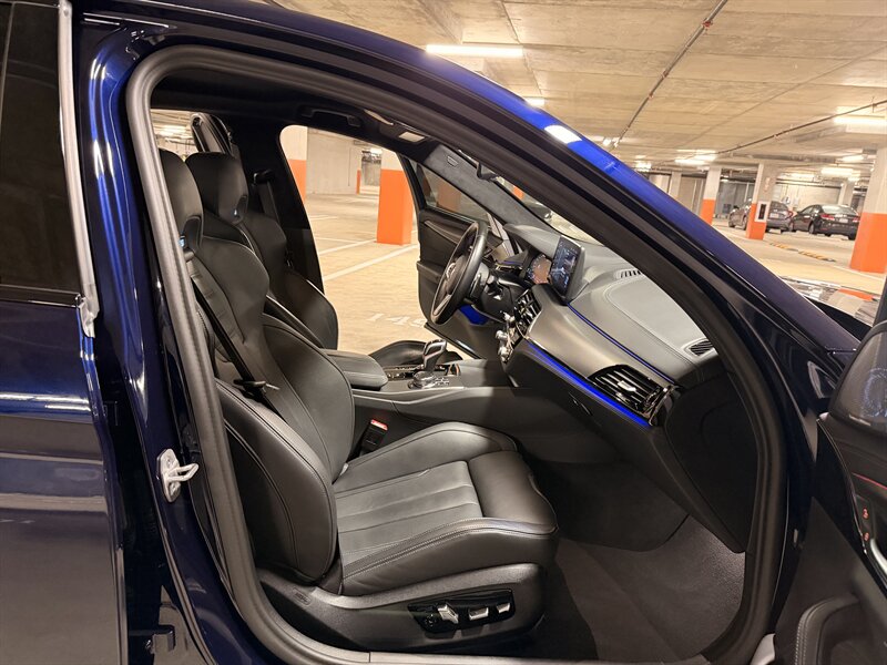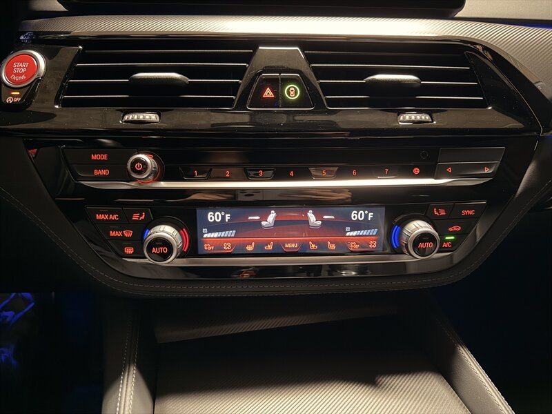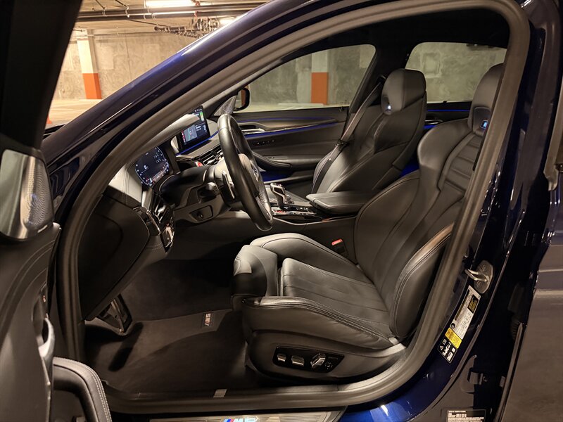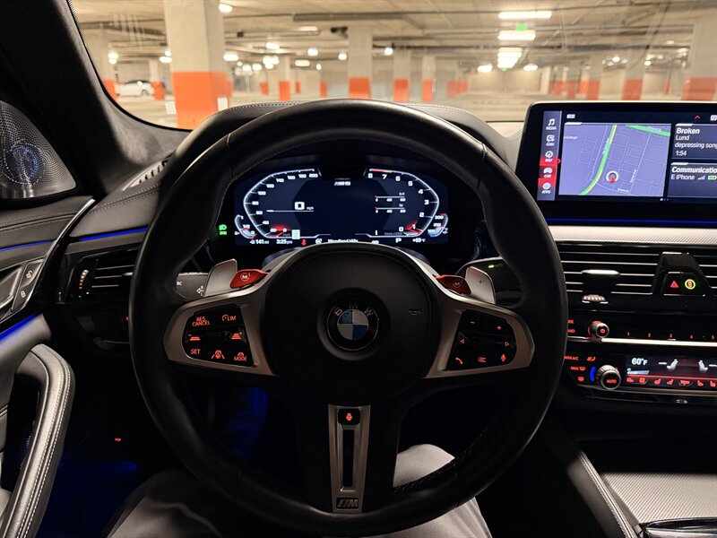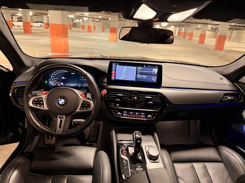 The M5 Competition comes equipped from the factory with high-resolution digital gauges and BMW’s intuitive iDrive interface, navigation, smartphone integration (Apple CarPlay/Android Auto compatibility), multifunction M steering wheel, sport seats with strong lateral support, power and memory adjustments, multi-zone automatic climate control, keyless access and start, a comprehensive suite of airbags and electronic stability/traction systems, rearview camera and front/rear parking sensors. The interior is driver-focused with premium materials and M-specific appointments throughout.