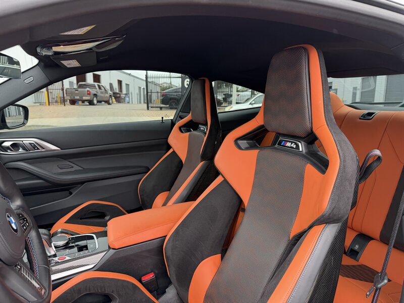 2024 BMW M4 Competition — Skyscraper Grey Metallic over Kyalami Orange/Black interior. This one-owner, clean CARFAX example is in excellent overall condition with under 20,000 miles (averaging less than 7,000 miles per year). Powered by the 3.0L Twin-Turbo inline-6 producing 503 hp and 479 lb-ft of torque, the M4 Competition pairs exhilarating performance with surprising everyday usability — EPA ratings are 16 MPG city and 23 MPG highway.